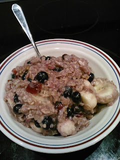 - Bring water and all ingredients excepts oats, bananas, and blueberries to boil